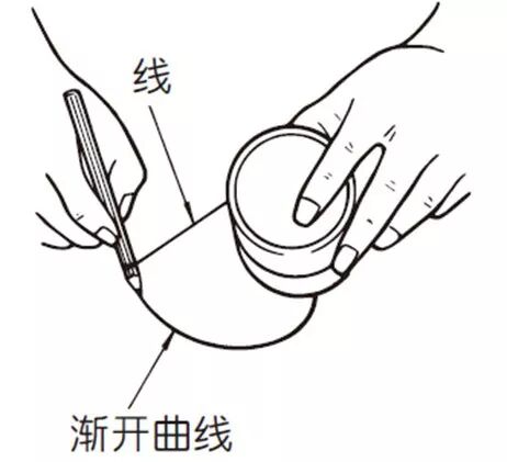 将一端系有铅笔的线缠在圆筒的外周上,然后在线绷紧的状态下将线渐渐放开。此时,铅笔所画出的曲线即为渐开曲线。圆筒的外周被称为基圆。