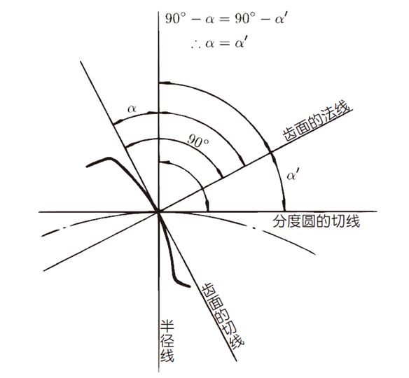 压力角是在齿面的一点(一般是指节点)上,半径线与齿形的切线间所成之角度。如图所示,α为压力角。因为α’=α,所以α’也是压力角。