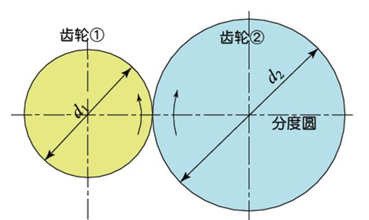 两轮啮合时的模样,看上去就像是分度圆直径大小为d1、d2两个摩擦轮(Friction wheels)在传动。但是,实际上渐开线齿轮的啮合取决于基圆而不是分度圆。