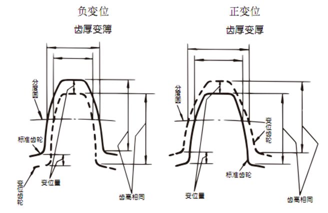 变位有正变位和负变位。虽然齿高相同,但齿厚不同。齿厚变厚的为正变位齿轮,齿厚变薄的为负变位齿轮。