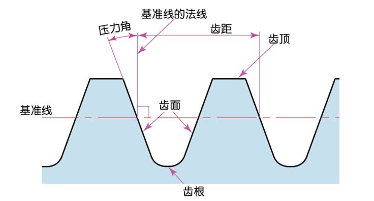 齿厚 (s)的基准是齿距的一半。s=πm/2。