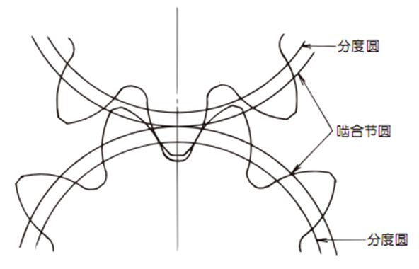 标准齿轮是在各个齿轮的分度圆相切状态下啮合。而经过变位的齿轮的啮合,如图所示,是在啮合节圆上相切啮合。啮合节圆上的压力角称为啮合角。啮合角与分度圆上的压力角(分度圆压力角)不同。啮合角是设计变位齿轮时的重要要素。