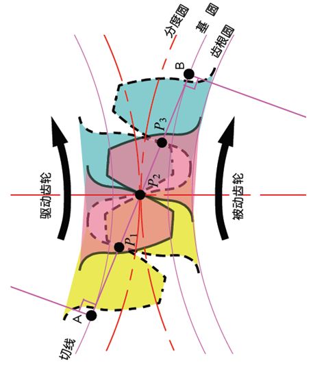 两个齿轮齿形的啮合接触点按P1—P2—P3的顺序在啮合线上移动。请注意驱动齿轮中黄色的轮齿。这个齿开始啮合后的一段时间内,齿轮为两齿啮合(P1、P3)。啮合继续,当啮合点移动到分度圆上的点P2时,啮合轮齿只剩下了一个。啮合继续进行,啮合点移动到点P3时,下一个轮齿开始在P1点啮合,再次形成两齿啮合的状态。就像这样,齿轮的两齿啮合与单齿啮合交互重复传递旋转运动。