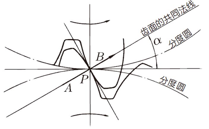 A齿在节点上推动B点。这个时候的推动力作用在A齿及B齿的共同法线上。也就是说,共同法线是力的作用方向,亦是承受压力的方向,α则为压力角。