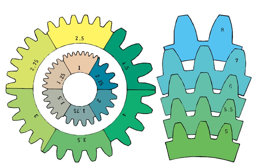 另外,在使用英制单位的国家(比如美国),使用符号(径节)及数字(分度圆直径为1英吋时的齿轮的轮齿数)来表示轮齿的大小。比如:DP24、DP8等。还有使用符号(周节)和数字(毫米)来表示轮齿大小的比较特殊的称呼方法,比如CP5、CP10。